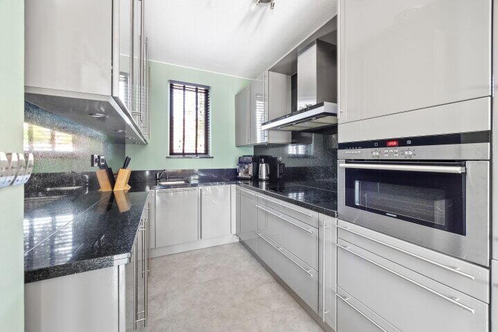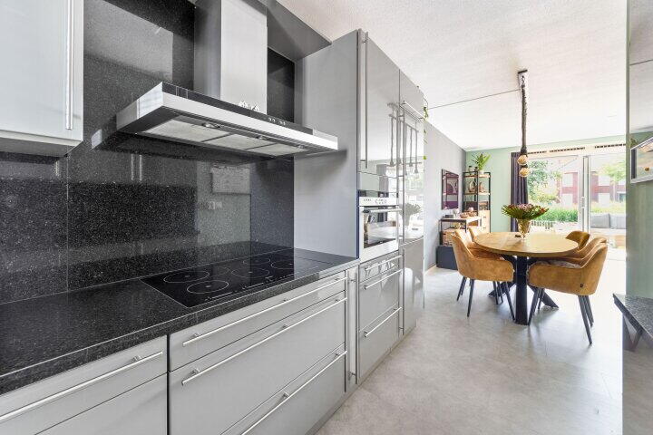 Bijvoorbeeld de keuken, die is opgesteld in een U-vorm. Zoals de lichtgrijze laden en kasten volop bergruimte bieden, bieden de hardstenen werkbladen alle ruimte om de maaltijd te bereiden. De keuken is voorzien van een inductiekookplaat en diverse Siemens-inbouwapparatuur.