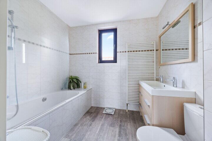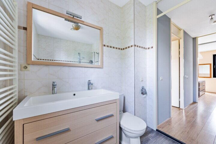 • Ruime badkamer met dubbele wastafel, douche-/ligbadcombinatie en tweede toilet