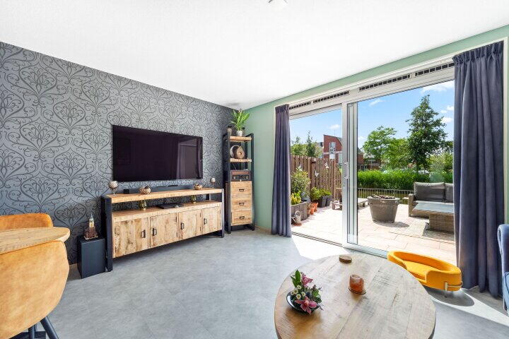• Zonnige woonkamer voorzien van vloerverwarming; grote glazen schuifpui waterterras